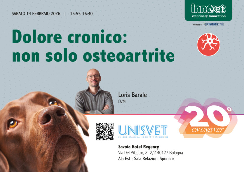 Sabato 14 febbraio, dalle 15:55 alle 16:40, Innovet darà il proprio contributo scientifico con una relazione su un tema di grande attualità per la clinica veterinaria: “Dolore cronico: non solo osteoartrite.”